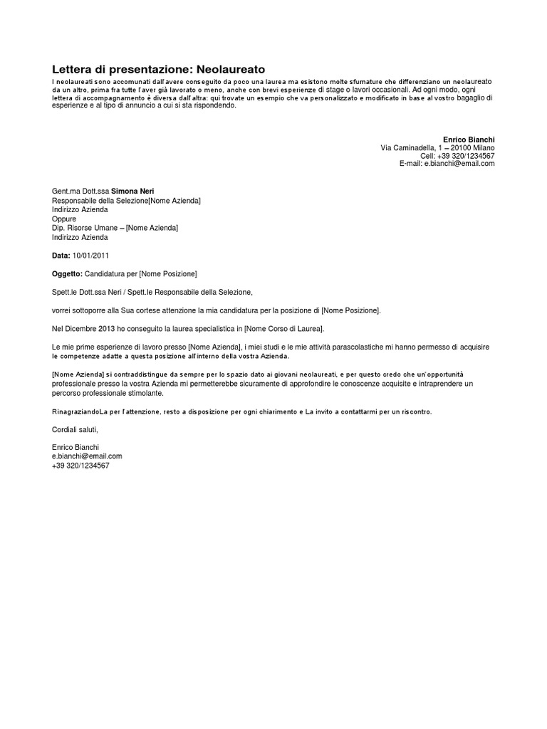 Lettera presentazione candidatura esempio. › it_it › creareCome Creare Una Lettera Di Presentazione Efficace | Canva Scrivere una lettera di presentazione e formattarla in modo che sia piacevole da vedere e facile da comprendere e leggere può essere complesso se non si dispone degli strumenti adatti. In questa guida ti spieghiamo come creare una lettera di presentazione con Canva in pochissimi minuti e che faccia davvero presa in fase di candidatura. intraprendere.net › 3624 › lettera-di-presentazioneLettera di Presentazione: 15 Accurati Esempi Per Trovare ... Mar 13, 2016 · Lettera di Presentazione: Esempio di accompagnamento in risposta a un’inserzione. Se invii un cv per proporre la tua candidatura in seguito a un annuncio letto su internet, la prima cosa da fare è citare il riferimento, il mezzo su cui è comparso e la data in cui è stato pubblicato. › email-diEsempio di Mail di Presentazione per Invio CV per un Lavoro È sempre più diffusa l’abitudine di inviare la lettera di presentazione nel corpo della mail e allegare direttamente il CV. Se ti stai chiedendo come redigere una bella mail formale di presentazione per un lavoro o autocandidatura… Scarica subito questo esempio di email di presentazione per un lavoro. › modelli-lettera-diModelli Lettera di Presentazione 2022 Word (Scarica Gratis) Download anche: CV Europass Perché è importante redigere una lettera di presentazione. In molti casi, creare una lettera di presentazione non è obbligatorio, tuttavia, è bene tenere a mente che si tratta di uno strumento fondamentale che ti permetterà di fornire ulteriori dettagli sulla tua persona e mostrare quanto sei veramente motivato a ottenere quel determinato lavoro, quella ...