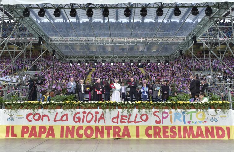 «Ragazzi promettete a Gesù e a me: mai bullismo, mai!» Comincia Davide, di Cornaredo, uno dei migliaia di cresimandi di quest'anno, che chiede al Papa che cosa lo ha aiutato quand'era bambino ad accrescere la sua fede e l'amicizia con Gesù. Il Papa risponde subito: « I nonni che hanno saggezza della vita », e instaura un vivace botta e risposta, interrotto più volte da applausi.