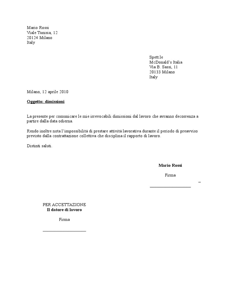 Come scrivere una lettera di dimissioni volontarie - OnlineCV Esempio di lettera di dimissioni senza preavviso ... La sottoscritta Laura Ponti, con la presente comunico le mie irrevocabili dimissioni dal lavoro. Dichiaro ... Modello lettera formale di dimissioni - Monster Modello lettera di dimissioni semplice ... Egr./Gent.ma [INSERISCI IL NOME DEL DATORE DI LAVORO/DIRETTORE],. Io sottoscritto/a [INSERISCI IL TUO NOME] con la ... Lettera di dimissioni volontarie con preavviso (+fac simile) - zety Feb 17, 2023 ... Una lettera di dimissioni è un documento necessario per comunicare al datore di lavoro la volontà di terminare il rapporto lavorativo prima ...